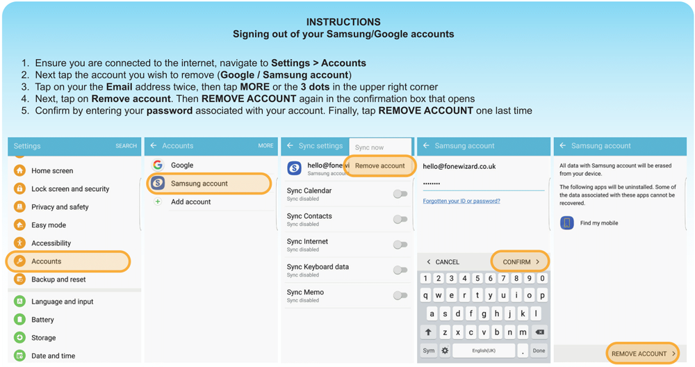 If we receive your device with Samsung account still active there may be a delay in processing and sending you your payment. Please follow instructions below to remove your accounts from your device.